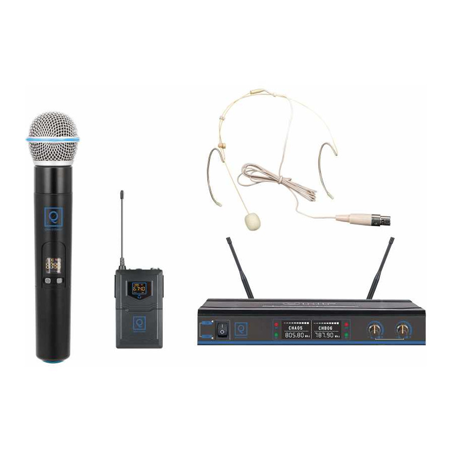 Sistema microfonico dual wireless UHF. Dual channel con frequenza fissa. Tecnologia IC Frequency Control integrata. Sincronizzazione IR. Mute mode intelligente. Composto da un trasmettitore palmare + un microfono earset con beltpack + un ricevitore. Risposta in frequenza del ricevitore 50Hz-18Khz. Risposta dinamica 105dB. Raggio d’azione 50m. Il trasmettitore palmare e il beltpack utilizzano 2 batterie AA da 1,5v ognuno.