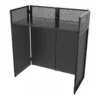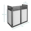 Tavolo da DJ completo e professionale per posizionare una consolle standalone o una consolle completa di lettori e mixer – al posto dei lettori è possibile posizionare due giradischi in versione battle (verticale) – la confezione comprende due teli elasticizzati (scrim), uno bianco e uno nero, oltre a una comoda borsa per il trasporto – gli scrim, in particolar modo quello bianco, possono essere retro-illuminati per proiettare pattern luminosi catch eye – il piano di appoggio è moquettato – si monta e smonta in 5 minuti